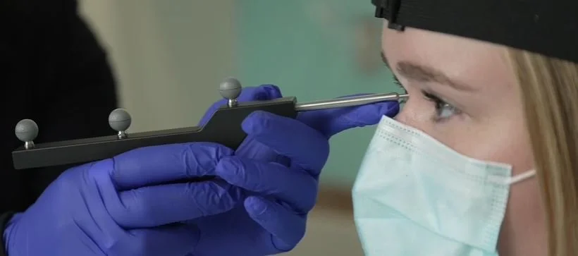 First, a headband is placed over the person’s head. The headband and the coil are equipped with three small 3D trackers each. They look like three small grey balls. The navigation system also comes with an infrared camera that detects these 3D trackers. In this way, the computer can create a model with the exact position of the subject and the coil within the room of the lab. This is actually the same technique which is used for 3D movies!